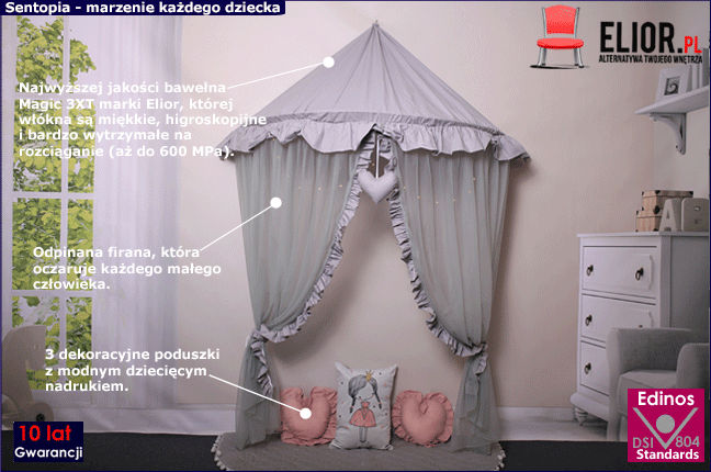 - przymocowany nad łóżeczkiem lub łóżkiem pociechy wspaniale otuli maluszka do snu, zapewni przytulne i bezpieczne miejsce do relaksu,