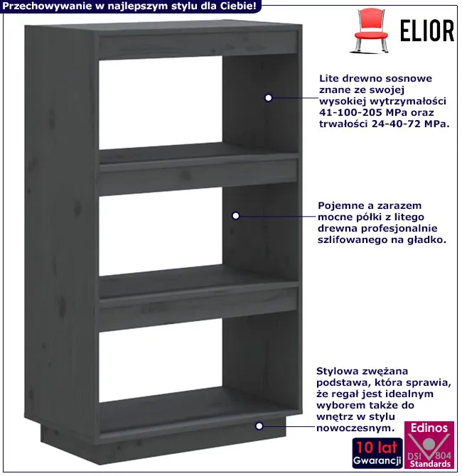 • Ekologiczny wybór: drewno sosnowe jest materiałem odnawialnym, co czyni regał wyborem przyjaznym dla środowiska.