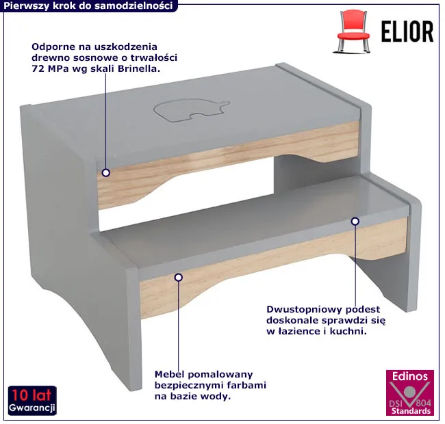 Jest stabilny, dobrze wyważony i dziecko może bezpiecznie z niego korzystać. Dzięki dwóm stopniom nadaje się nie tylko do łazienki, ale też do kuchni czy pokoju dziecięcego. Wysokość jest idealna, a powierzchnia antypoślizgowa naprawdę działa. Szary kolor neutralny, pasuje do każdego wnętrza. Produkt solidnie wykonany i dobrze przemyślany. Fajny gadżet, który zachęca dziecko do samodzielnych czynności. Polecam wszystkim rodzicom.
