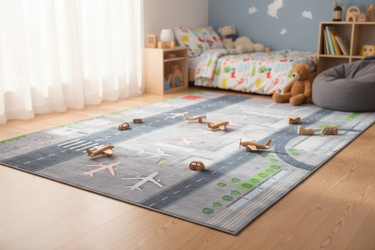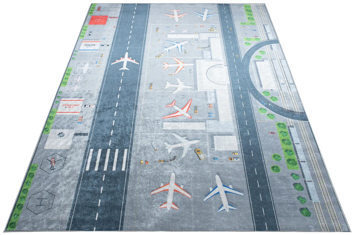 Dywany z kolekcji Kazo łączą w sobie atrakcyjny wygląd i funkcjonalność. Częrpia design ze stylu skandynawskiego i nowoczesnego. Wykonane w 100% z poliestru, z runem o wysokości 6 mm i wadze 900 g/m2, gwarantują komfort podczas codziennej zabawy. Dzięki możliwości odkurzania, zamiatania i prania, utrzymanie dywanu Kazo w czystości jest łatwe jak nigdy. Dodatkowo, antypoślizgowe wypustki na spodzie dywanu zapewniają bezpieczeństwo, niezależnie od intensywności zabawy. Natomiast drogi, miasta, lotniska, boiska to nieskończona przygoda dla małego odkrywcy, który kocha podróże, zabawy autami i grę w piłkę. Przekonaj się i zamów dywan z kolekcji Kazo już dziś!