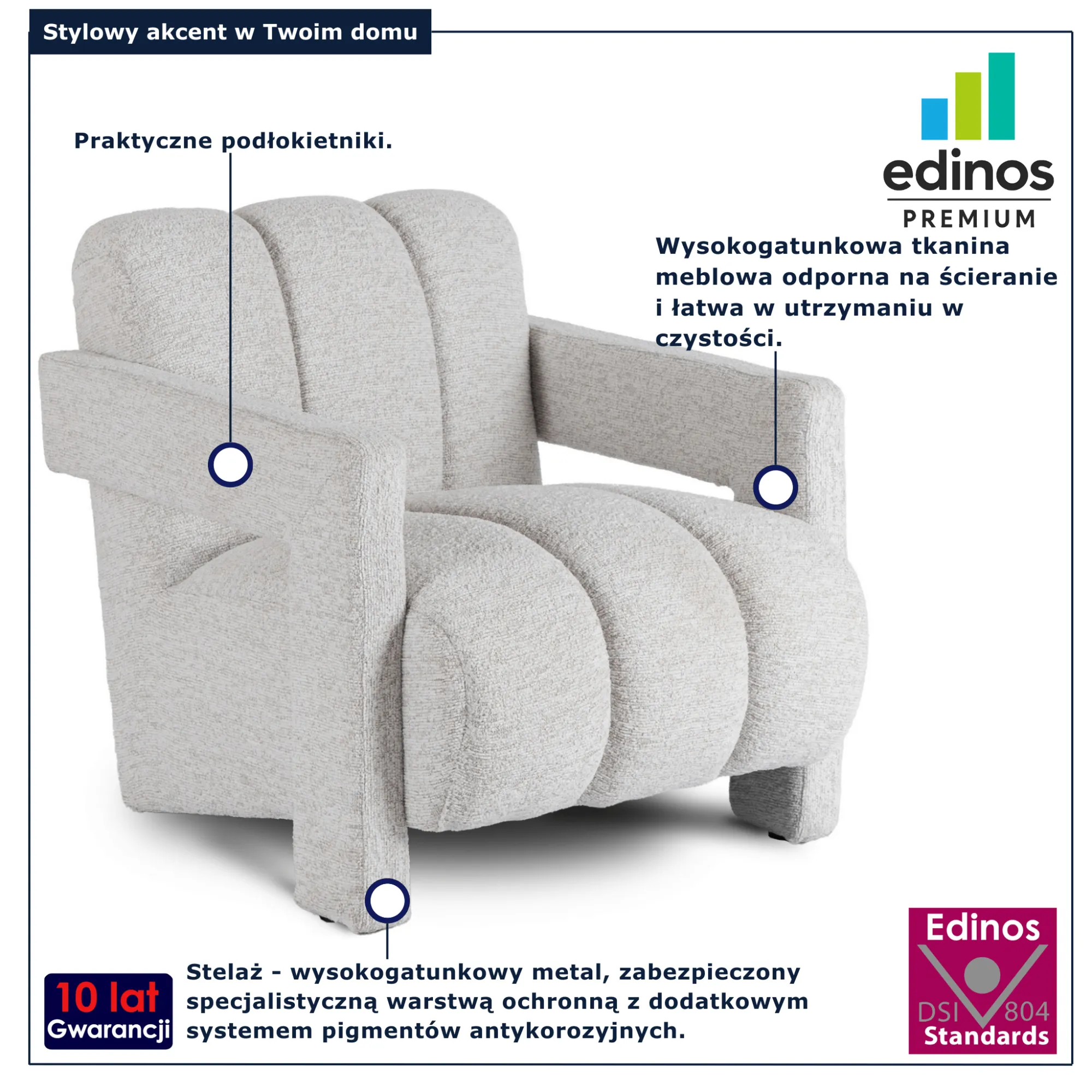 • Produkt posiada certyfikat jakości "Edinos Standards DSI 804", który potwierdza najwyższą jakość wykonania mebla oraz pełny stopień zgodności poszczególnych jednostek wytworzonego wyrobu z przyjętym wzorcem.