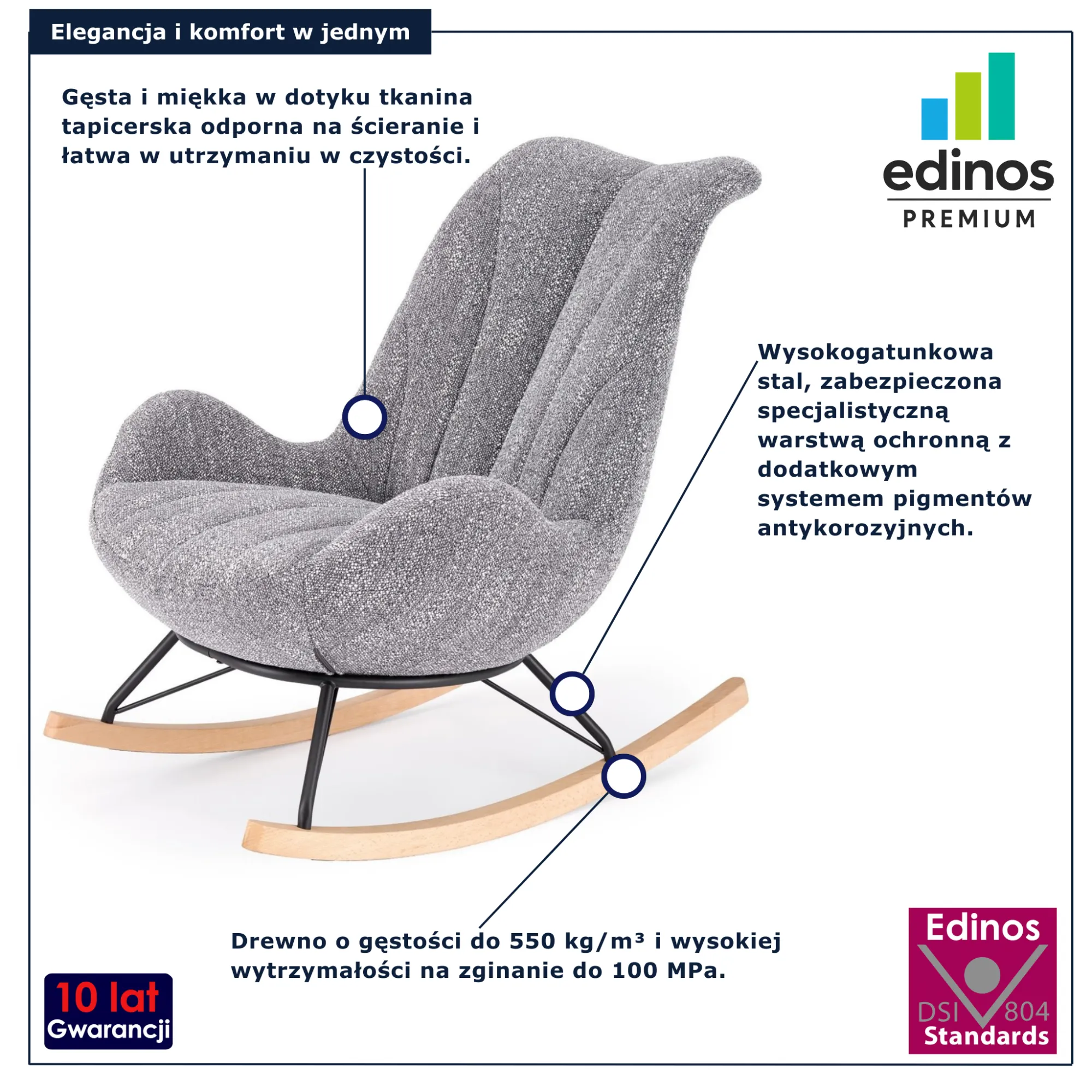 • Produkt posiada certyfikat jakości "Edinos Standards DSI 804", który potwierdza najwyższą jakość wykonania mebla oraz pełny stopień zgodności poszczególnych jednostek wytworzonego wyrobu z przyjętym wzorcem.