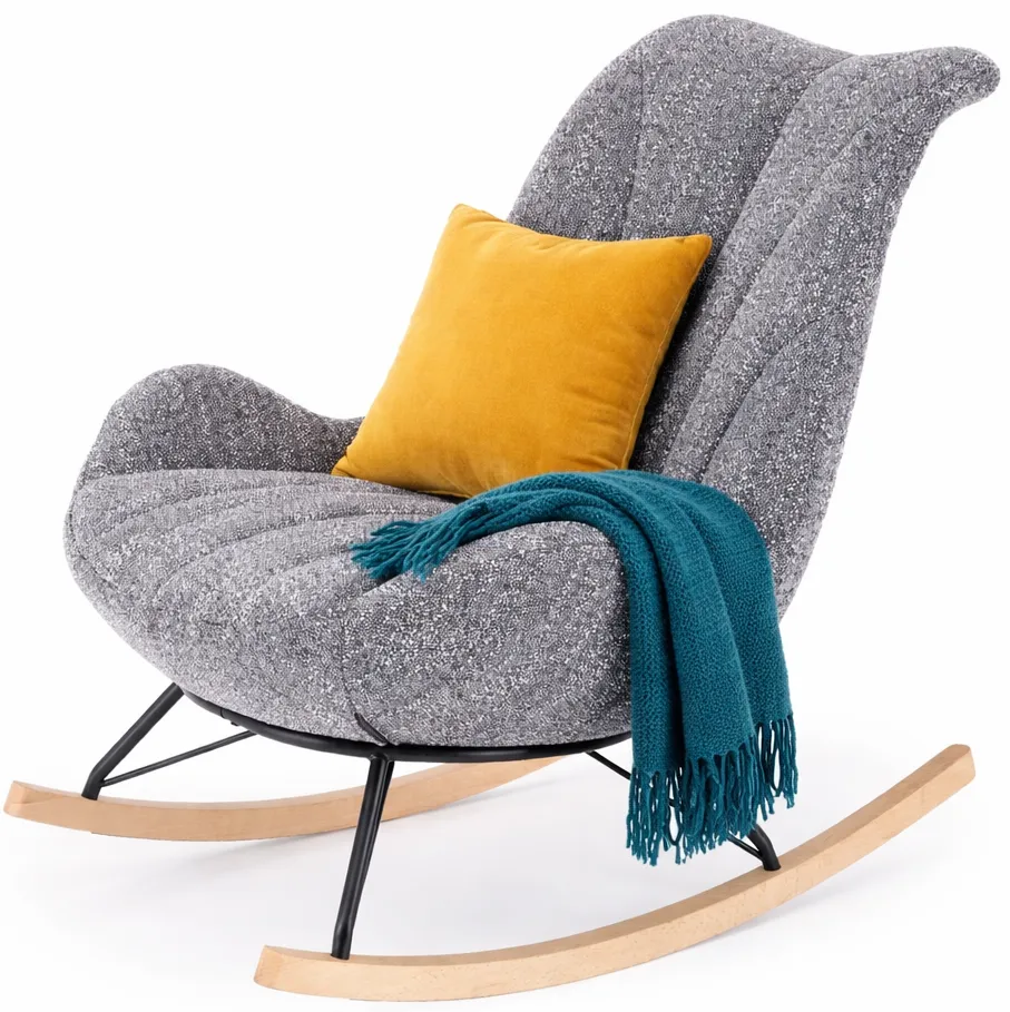 Przykładowa aranżacja z szarym miękkim fotelem bujanym Arezia