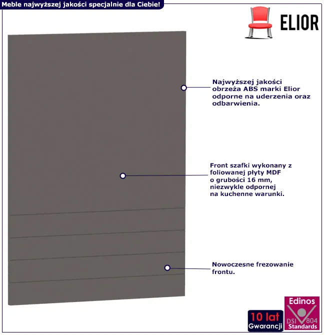 • Produkt posiada certyfikat jakości "Edinos Standards DSI 804", który potwierdza najwyższą jakość wykonania mebla oraz pełny stopień zgodności poszczególnych jednostek wytworzonego wyrobu z przyjętym wzorcem.