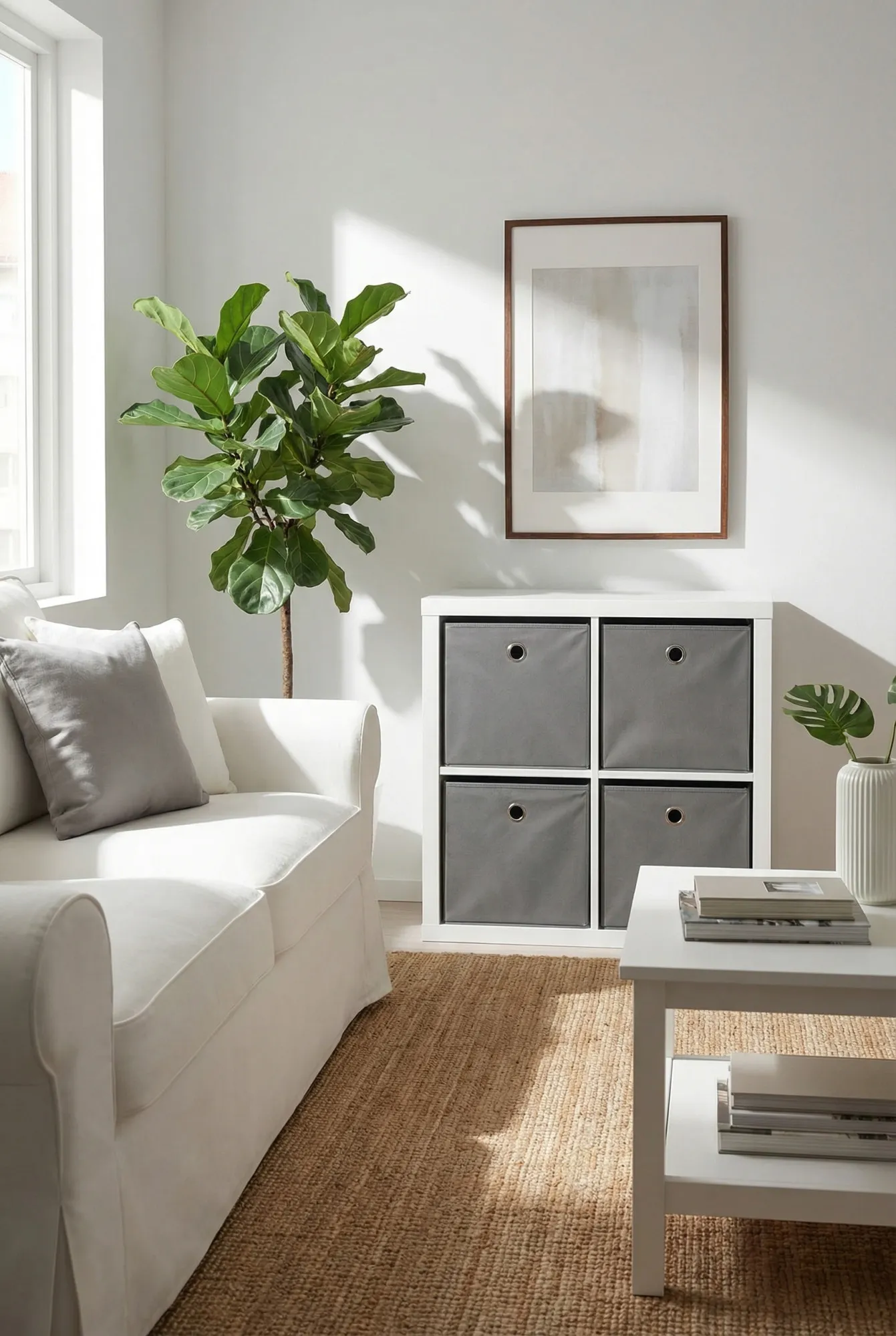 Aranżacja salonu z regałem z szarym kompletem 4 zamykanych pudełek Holm 3X