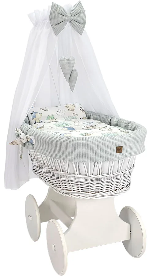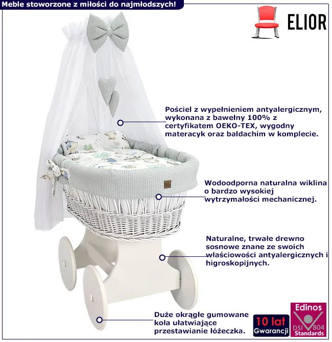 • Materiał: wiklina i wysokogatunkowe drewno sosnowe pomalowane bezpieczną dla dzieci emulsją, pościel to 100% bawełna z certyfikatem OEKO-TEX, wypełnienie antyalergiczne.