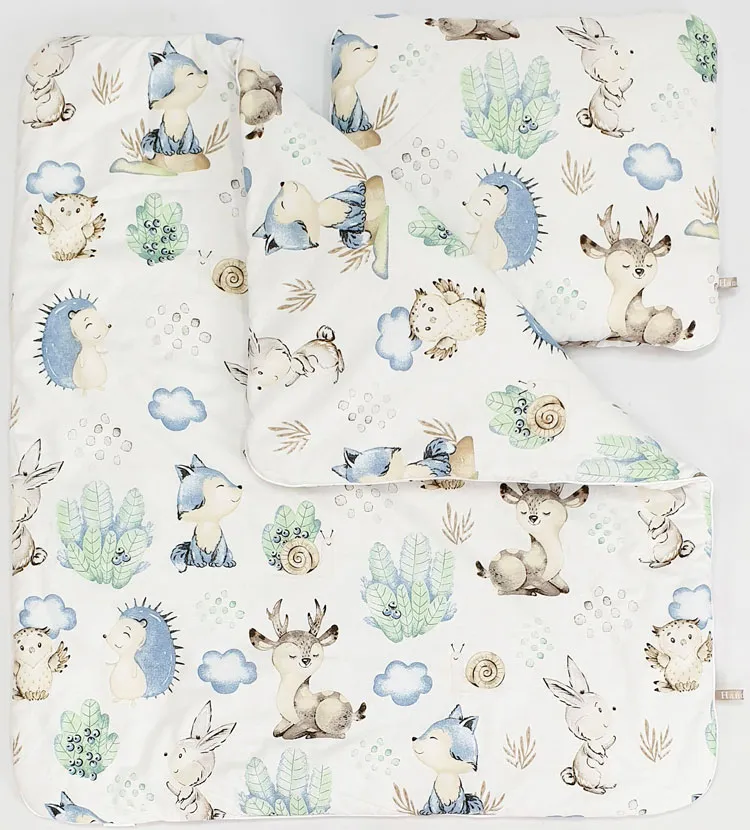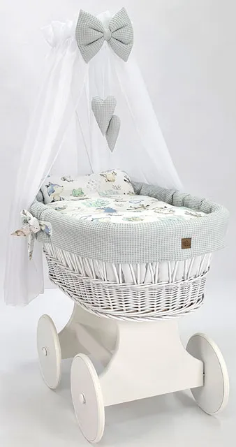 bawełniany zestaw pościeli do kosza (wyłożenie do kosza, kołderka 70×80 cm, poduszka 20×30 cm, prześcieradełko) oraz baldachim.
