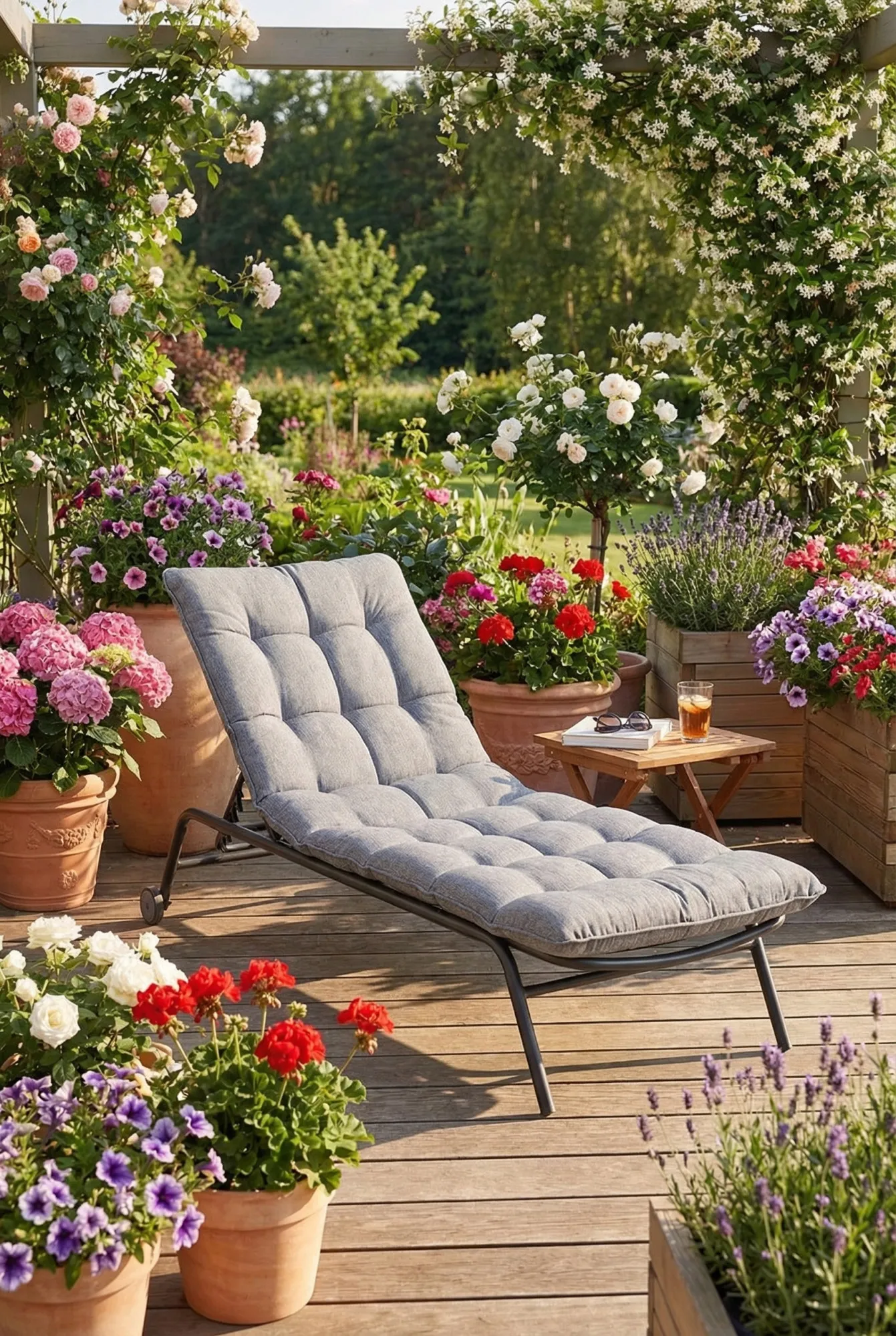 Poniżej przedstawiamy przykładową wizualizację ogrodu z wykorzystaniem leżaka ogrodowego Sunira: