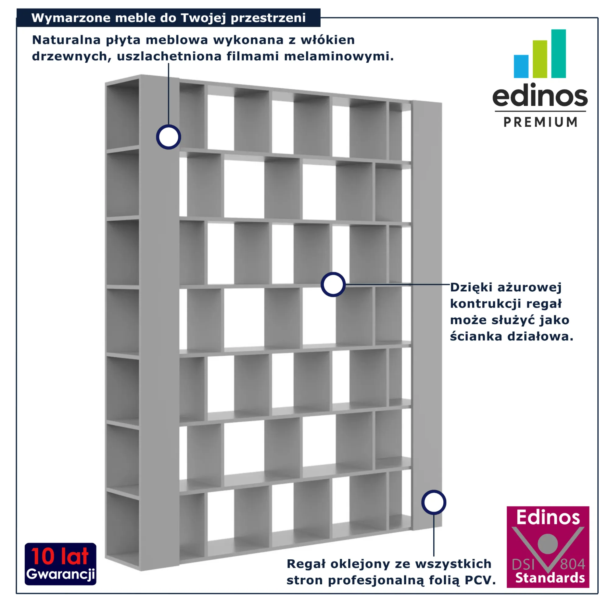 • Produkt posiada certyfikat jakości "Edinos Standards DSI 804", który potwierdza najwyższą jakość wykonania mebla oraz pełny stopień zgodności poszczególnych jednostek wytworzonego wyrobu z przyjętym wzorcem.