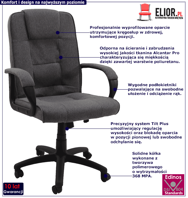 Jeśli pracujesz bądź spędzasz dużo czasu przed komputerem potrzebujesz ergonomicznego fotela. Fotela Nomari. To on pomoże Ci zminimalizować skutki uboczne siedzącego trybu pracy. Uchronisz się przed bólami pleców, szyi, barków, a w konsekwencji przed poważnymi schorzeniami. Komfortowe oparcie, regulacja wysokości, podłokietniki i swobodne odchylanie się to funkcje, które są niezbędne w idealnym fotelu obrotowym. Dodatkową zaletą fotela Nomari jest stabilna, pięcioramienna podstawa i wytrzymałe kółka jezdne wykonane z profesjonalnego tworzywa polimerowego. Ich wytrzymałość utrzymuje się na poziomie 368 MPa. Nie zapomnieliśmy także o jakże istotnym elemencie jakim jest tapicerka. Naszym priorytetem jest najwyższa jakość wykorzystanych do produkcji surowców. W przypadku fotela Nomari postawiliśmy na miękką, łatwą w utrzymaniu czystości, wysokojakościową tkaninę typu Alcantar Pro. Charakteryzuje się dużą odpornością na ścieranie i zabrudzenia, co jest bardzo ważne w przypadku mebla codziennego użytku. Tkanina ta jako jedyna na rynku produkowana jest z dokładnie wyselekcjonowanych ultramikrowłókien o objętości aż do 24-razy drobniejszej od ludzkiego włosa. Czyni ją to niezwykle wytrzymałą i przyjemną w dotyku. To dzięki niej siedzisko jest miękkie i przyjemne, co będzie miało znaczenie podczas wielogodzinnej pracy. Zainwestuj więc w to, co dla Ciebie najlepsze i zamień swoje obowiązki w miłe chwile spędzone na ultra wygodnym fotelu!
