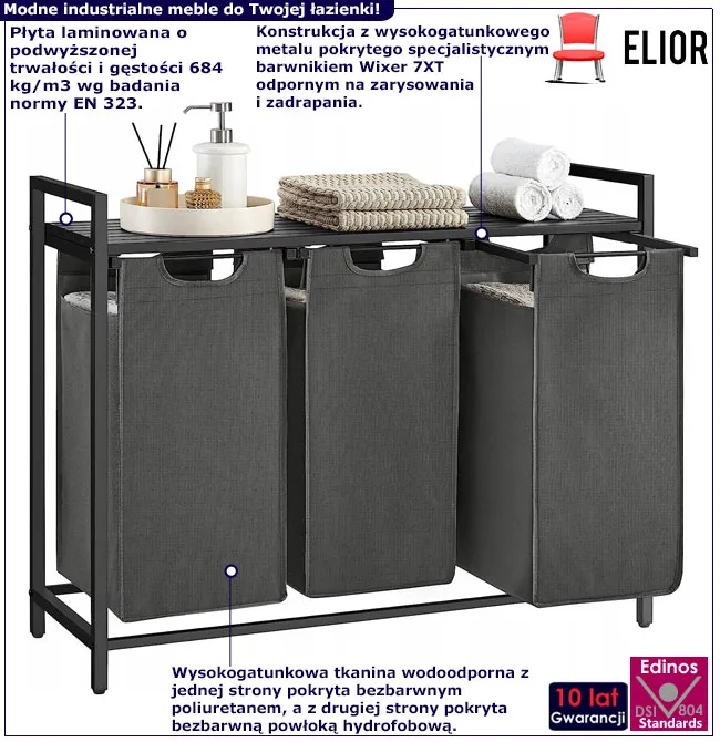 Nie ryzykuj i nie mieszaj kolorów przy praniu. Szkoda Twoich ukochanych ubrań! Specjalnie dla Ciebie oferujemy stylową szafkę z koszami na pranie Bedos 4X marki Elior. Dziś możesz kupić ją w niepowtarzalnej cenie. Powyższa oferta dotyczy regału w promocyjnej cenie 218 zł. Regularna cena tego mebla to 278 zł. Zamawiając go właśnie teraz zyskujesz aż 60 zł rabatu!
