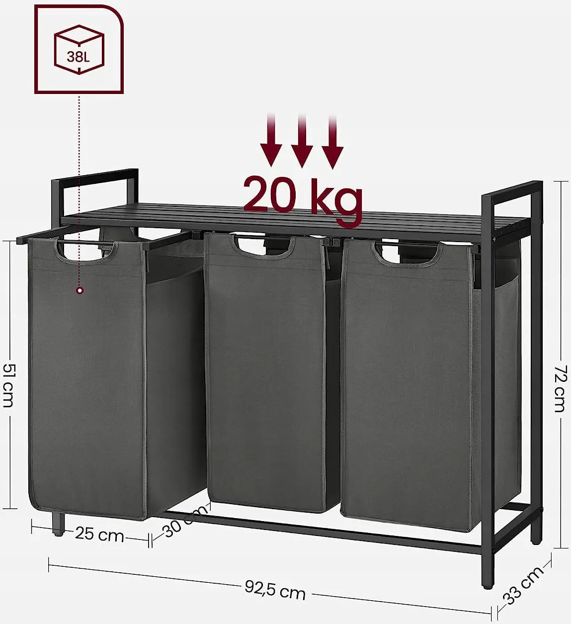 - Wymiary: wysokość 71 cm; szerokość 92,5 cm; głębokość 33 cm; wymiary każdego kosza: szerokość 25 cm, głębokość 30 cm, wysokość 51 cm.