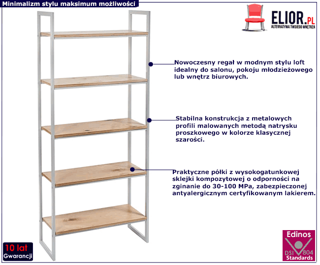 Minimalistyczny regał Maso 10X marki Elior to nowoczesny projekt dedykowany miłośnikom niesztampowego designu, minimalizmu aranżacyjnego i ponadczasowej jakości. Konstrukcja regału Maso 10X powstała z najwyższej jakości metalu pomalowanego proszkowo profesjonalnym barwnikiem w odcieniu klasycznej szarości. Najwyższa jakość techniki metody natrysku proszkowego pozwoliła zaoferować firmie Elior aż 10 lat gwarancji na swoje produkty. Technika malowania proszkowego charakteryzuje się dużą trwałością, odpornością na korozję, chemikalia, wysoką temperaturę oraz uszkodzenia mechaniczne, dzięki czemu znacznie podnosi walory użytkowe i estetyczne mebla. Regał Maso 10X został wyposażony w 5 praktycznych półek z naturalnej sklejki kompozytowej zbudowanej z krzyżujących się cienkich warstw drewna (obłogów). Dla zwiększonej trwałości sklejka składa się z nieparzystej liczby obłogów, dzięki czemu jest niezwykle elastyczna, daje się łatwo modelować, charakteryzuje się ponadprzeciętną trwałością i odpornością na zginanie do 30-100 MPa ( według normy PN-EN 310). Półki o grubości 18 mm zostały przykręcone do metalowych profili specjalistycznymi metalowymi śrubami, dzięki czemu są wyjątkowo stabilne i wytrzymałe na nacisk. Dla podniesienia jakości i walorów estetycznych półki zostały precyzyjnie zabezpieczone certyfikowanym lakierem o właściwościach antystatycznych i hipoalergicznych. Tak wykonany regał Maso 10X marki Elior to kwintesencja doskonałej jakości i gwarancja wieloletniej trwałości.