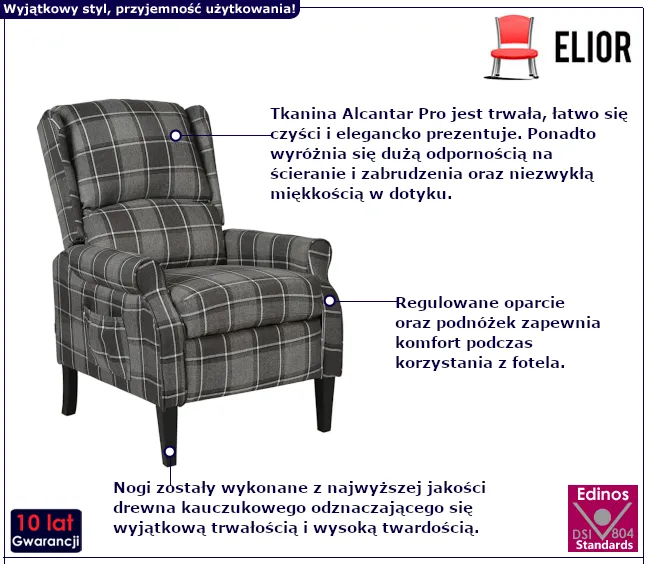 Wyobraź sobie fotel, który nie tylko dostosowuje się do Twoich potrzeb, ale także staje się ulubionym miejscem w Twoim domu. Takim meblem jest Cortis marki Edinos Premium. Jego elegancki szary wzór w kratkę przyciąga spojrzenia i dodaje wnętrzu charakteru, jednocześnie zachęcając do chwili relaksu. Cortis to więcej niż zwykły fotel – to Twój towarzysz odpoczynku, który zaskakuje funkcjonalnością i wygodą. Dzięki rozkładanej konstrukcji, regulowanemu oparciu i wbudowanemu podnóżkowi możesz z łatwością znaleźć idealną pozycję do czytania, oglądania filmów czy po prostu drzemki. Praktyczna kieszonka na drobiazgi sprawia, że wszystko, czego potrzebujesz, masz zawsze pod ręką. Solidne, drewniane nóżki z litego drewna kauczukowego dodają całości stabilności i uroku, tworząc mebel, który spełni wszystkie Twoje oczekiwania.