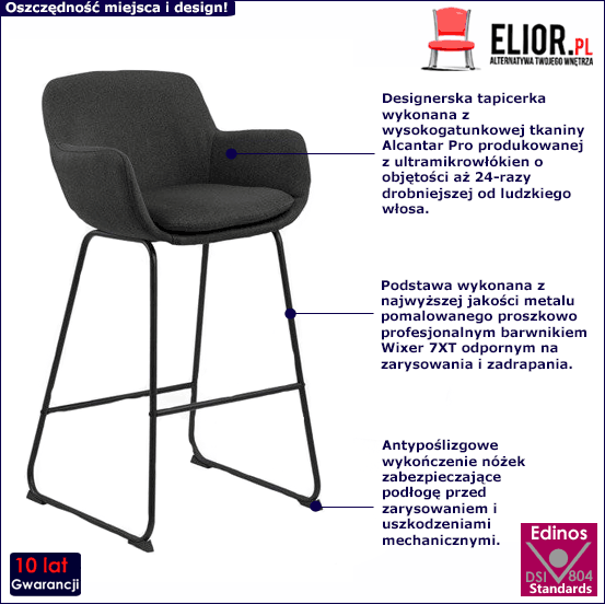 Tapicerka to nie tylko wygoda i komfort. Odpowiednio wybrana tkanina pozwala również na wykorzystanie mebla jako oryginalnej dekoracji, która w nietuzinkowy sposób wypełni wnętrze Twojego domu nadając mu klimatu. Tkanina Alcantar Pro wykorzystana do produkcji hokera Marbos jest trwała, łatwo się czyści i elegancko prezentuje. Ponadto charakteryzuje się dużą odpornością na ścieranie i zabrudzenia oraz niezwykłą miękkością w dotyku (dzięki warstwie poliuretanu). Tkanina Alcantar Pro, która jako jedyna na rynku produkowana jest z dokładnie wyselekcjonowanych ultramikrowłókien o objętości aż do 24-razy drobniejszej od ludzkiego włosa, charakteryzuje się wyjątkową żywotnością, odpornością oraz niezwykłą łatwością w utrzymaniu. Posiada ponadprzeciętne cechy wytrzymałościowe, dzięki czemu unikniesz co sezonowej wymiany tapicerki. Konstrukcja mebla wykonana została z najwyższej jakości metalu/stali nierdzewnej pomalowanej proszkowo odpornym na zarysowania i zadrapania. Najwyższa jakość techniki metody natrysku proszkowego pozwoliła zaoferować firmie Elior aż 10 lat gwar. na swoje produkty. Technika malowania proszkowego charakteryzuje się dużą trwałością, odpornością na korozję, chemikalia, wysoką temperaturę oraz uszkodzenia mechaniczne, dzięki czemu znacznie podnosi walory użytkowe i estetyczne mebla. Ponadto nóżki hokera zostały dodatkowo wyposażone w antypoślizgowe wykończenie zapewniające całkowitą ochronę podłóg Twojego domu przed zarysowaniami i uszkodzeniami mechanicznymi.