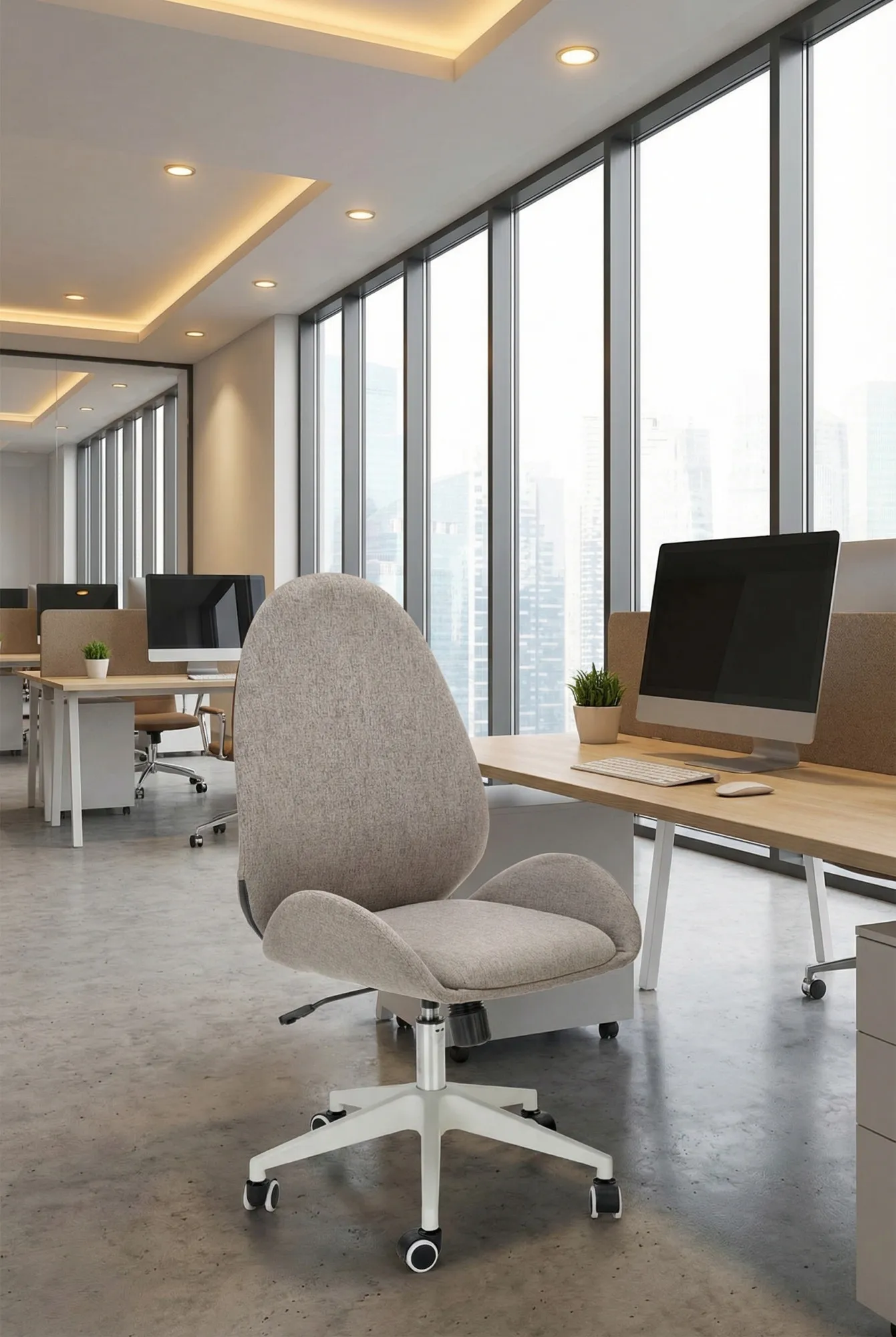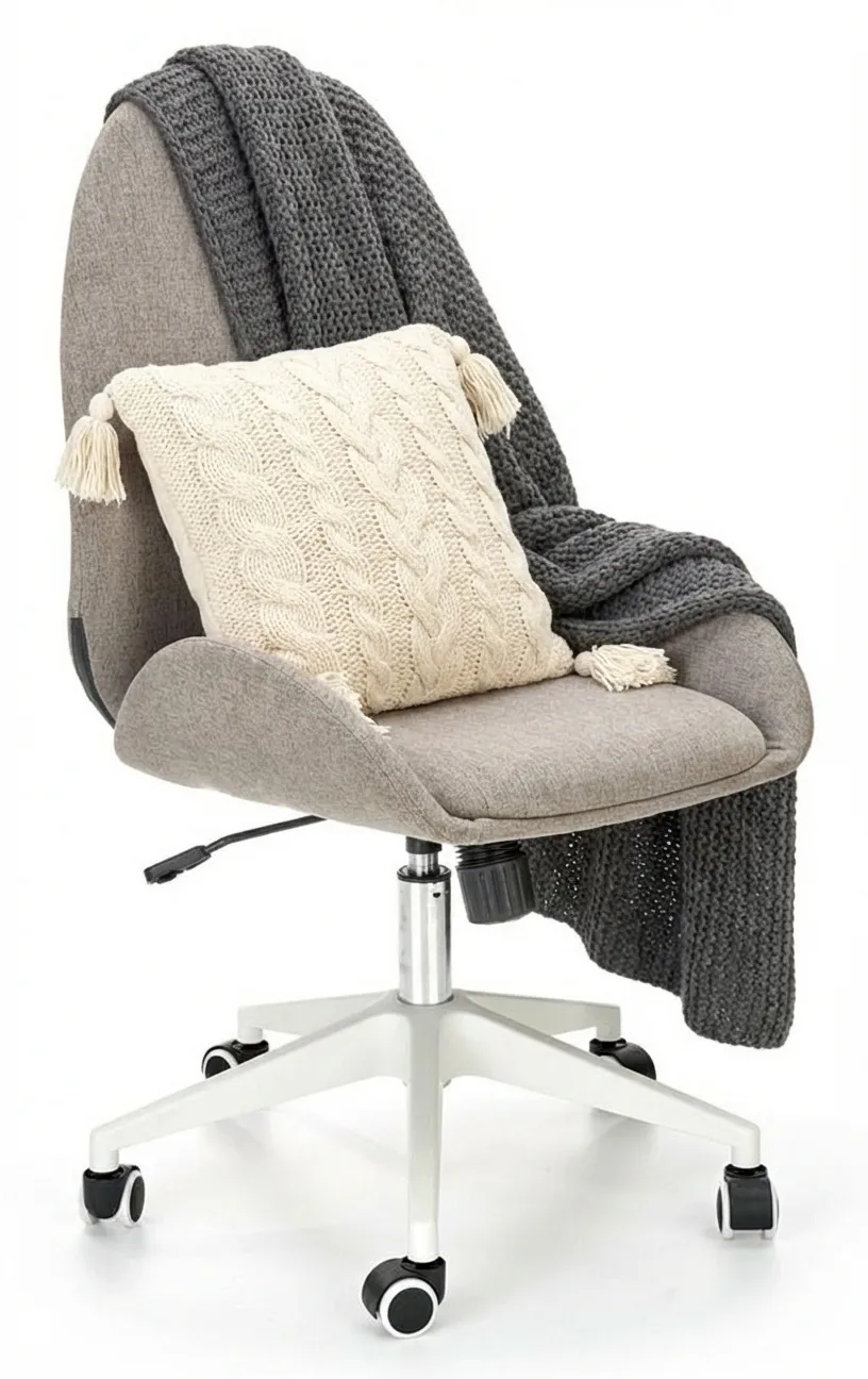 Biuro z wykorzystaniem szarego fotela obrotowego tapicerowanego Fugi