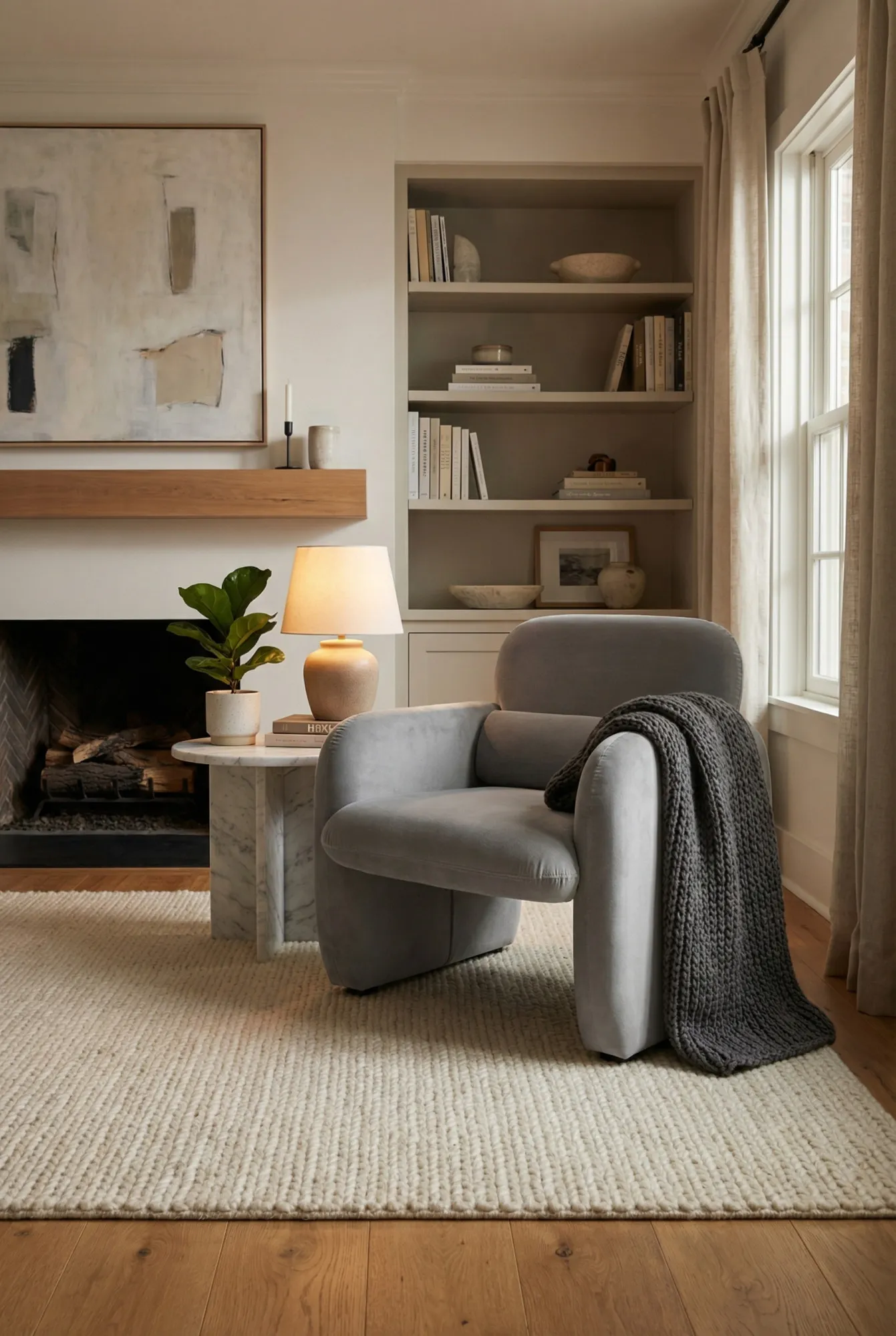 Salon z wykorzystaniem welwetowego szarego fotela Etilion 4X