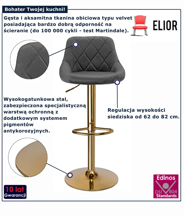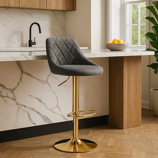 W sumie prezentuje się bardzo elegancko, welur ma przyjemną w dotyku fakturę, a złota podstawa dodaje całości szyku. Sprawdza się świetnie przy wyspie kuchennej.