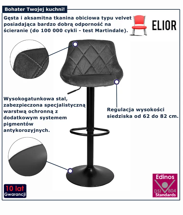 Tapicerka jest miękka i estetyczna, a welur wygląda solidnie. Hoker stoi stabilnie, nogi dobrze spasowane, nic się nie chwieje. Design bardzo dobrze pasuje do mojej kuchni nowocześnie i ze stylem. Jest super.