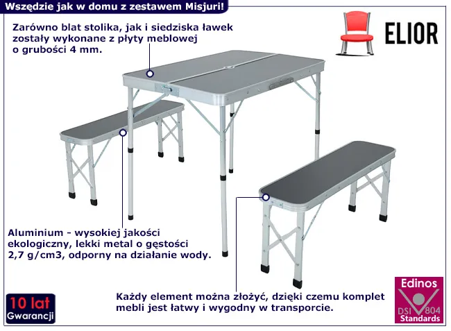 Idealny zestaw na biwakowanie. Stolik i ławki są wygodne, a montaż i demontaż przebiega szybko i sprawnie. Materiały są bardzo wytrzymałe, a całość wygląda estetycznie. Misjuri to najlepsze, co mogłem znaleźć w tej cenie. Cała rodzina jest zadowolona i chętnie spędzamy więcej czasu na świeżym powietrzu.