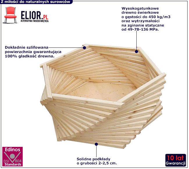 • Materiał: Wysokogatunkowe lite drewno świerkowe oraz profesjonalna folia.