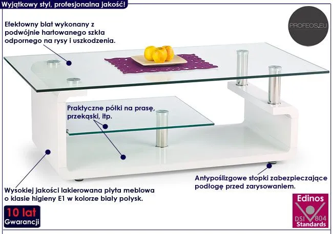 Przedstawiamy Ci zachwycającą ławę Zirkos marki Profeos. Produkty Profeos charakteryzują się wyrazistym designem i dbałością o każdy szczegół mebla, a wdzięk i nowoczesność, jak również mocna i stabilna konstrukcja, to cechy najnowszego stolika Zirkos. Designerski blat w prostokątnym kształcie wyprodukowano z podwójnie hartowanego szkła o grubości 9 mm, dzięki czemu jest całkowicie odporny na rysy i uszkodzenia. Efektowna konstrukcja w kolorze biały połysk wykonana została z lakierowanej płyty meblowej o klasie higieny E1, uszlachetnionej cienkimi filmami melaminowymi. Posiada także specjalne włókna ułożone różnokierunkowo o strukturze sinusoidalnej, co zapewnia nadanie jej cech jakościowych oraz wytrzymałościowych. Dwie pojemne półki na prasę czy przekąski są wyjątkowo praktyczne i pozwalają Ci zaoszczędzić miejsce na blacie głównym, a także utrzymać na nim porządek. Stonowana kolorystyka i prosta forma sprawiają, że stolik kawowy Zirkos doskonale sprawdza się we wnętrzach urządzonych w stylu skandynawskim, jak też minimalistycznym czy nowoczesnym. Zapewnia Ci również niezapomniane chwile przy kawie w gronie przyjaciół i rodziny, czy też samotnej lekturze. Stwórz w swoim domu niepowtarzalny i ciepły klimat z ławą marki Profeos!