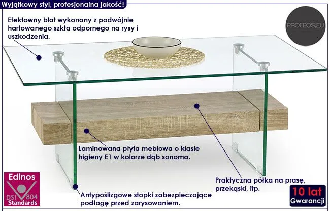 Komfortowa i efektowna ława Dantes wyróżnia się nie tylko swoją praktyczną formą i niebanalnym kształtem, ale także zastosowaniem materiałów najlepszej jakości. To dlatego cieszy się ona powodzeniem wśród osób wybierających nowatorskie rozwiązania. Oryginalna w formie konstrukcja ławy wykonana została z podwójnie hartowanego szkła o grubości 9 mm, dzięki czemu jest ona całkowicie odporna na rysy i uszkodzenia. Użyta do wyrobu półki laminowana płyta meblowa została uszlachetniona cienkimi filmami melaminowymi. Posiada także specjalne włókna ułożone różnokierunkowo o strukturze sinusoidalnej, co zapewnia nadanie jej cech jakościowych oraz wytrzymałościowych. Duża półka na prasę czy przekąski w kolorze dąb sonoma jest niezwykle praktyczna i pomaga Ci zaoszczędzić miejsce na blacie głównym, a także utrzymać na nim porządek. Minimalistyczny styl i mistrzowski urok bez zbędnego przerostu formy nad treścią, pozwolą Ci w końcu odpocząć od codziennego wyścigu. Ława Dantes dodaje wnętrzu harmonii i elegancji, a każda kawa przy niej wypita smakuje doskonale. Pozwól jej oczarować Cię swym blaskiem!