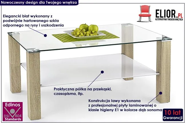 Komfortowa ława Afton wyróżnia się nie tylko swoją praktyczną formą i oryginalnym kształtem, ale także zastosowaniem materiałów najlepszej jakości. To dlatego cieszy się on powodzeniem wśród osób lubiących nowatorskie rozwiązania. Designerski blat w prostokątnym kształcie wyprodukowano z podwójnie hartowanego szkła o grubości 9 mm, dzięki czemu jest całkowicie odporny na rysy i uszkodzenia. Konstrukcja ławy wykonana została z profesjonalnej laminowanej płyty meblowej, uszlachetnionej cienkimi filmami melaminowymi. Posiada także specjalne włókna ułożone różnokierunkowo o strukturze sinusoidalnej, co zapewnia nadanie jej cech jakościowych oraz wytrzymałościowych. Szklana półka w kolorze mlecznym jest niezwykle praktyczna, gdyż pomaga Ci zaoszczędzić miejsce na stole, a także utrzymać na nim porządek. Stolik dostępny jest w dwóch wersjach kolorystycznych: dąb sonoma oraz biały połysk, z łatwością więc wybierzesz ten, który lepiej scharakteryzuje Twoje cztery kąty. Ława Afton dodaje wnętrzu harmonii i elegancji, a każda kawa przy niej wypita smakuje doskonale. Pozwól jej olśnić Cię swym blaskiem...