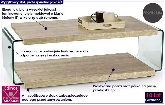 Komfortowa i elegancka ława Pasadena wyróżnia się nie tylko swoją praktyczną formą i efektownym kształtem, ale także zastosowaniem materiałów najlepszej jakości. To dlatego cieszy się ona powodzeniem wśród osób wybierających nowatorskie rozwiązania. Efektowny blat w kolorze dąb sonoma wykonany jest z laminowanej płyty meblowej o klasie higieny E1, uszlachetnionej cienkimi filmami melaminowymi. Posiada także specjalne włókna ułożone różnokierunkowo o strukturze sinusoidalnej, co zapewnia nadanie jej cech jakościowych oraz wytrzymałościowych. Oryginalną w formie konstrukcję mebla wyprodukowano z podwójnie hartowanego szkła o grubości 9 mm, dzięki czemu jest całkowicie odporny na rysy i uszkodzenia. Duża półka na prasę czy przekąski jest niezwykle praktyczna i pomaga Ci zaoszczędzić miejsce na blacie głównym, a także utrzymać na nim porządek. Modna kolorystyka i prosta forma sprawiają, że stolik kawowy Pasadena doskonale sprawdza się we wnętrzach urządzonych zarówno w stylu skandynawskim, jak też minimalistycznym czy nowoczesnym. Ława dodaje wnętrzu harmonii i elegancji, a każda kawa przy niej wypita smakuje doskonale. Pozwól jej oczarować Cię swym blaskiem!