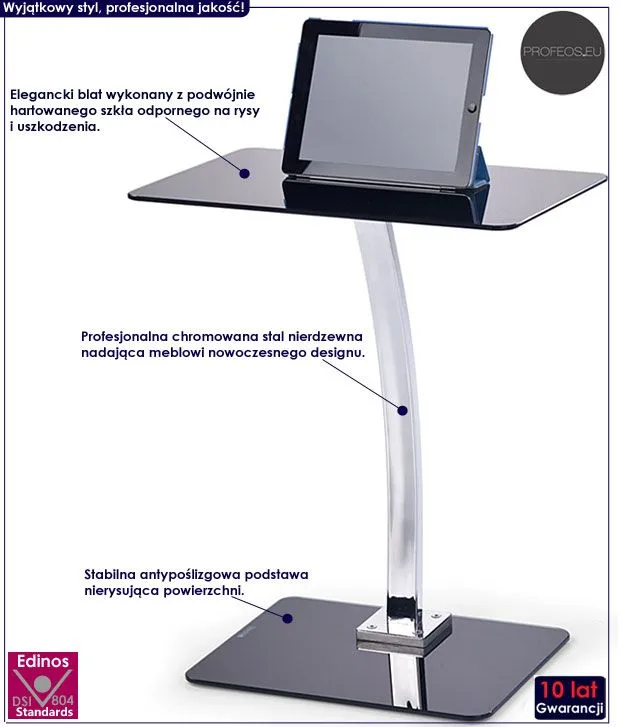 Stolik komputerowy Honcha wyróżnia się nie tylko swoją praktyczną formą i efektownym kształtem, ale także zastosowaniem materiałów najlepszej jakości. To dlatego cieszy się on powodzeniem wśród osób wybierających nowatorskie rozwiązania. Oryginalny profil mebla stworzony został z najwyższej jakości chromowanej stali o zawartości aż stali nierdzewnej oraz chromu, co gwarantuje mu niezwykły efekt wizualny, posiadając przy tym ponadprzeciętne cechy antykorozyjne oraz lepszą odporność na uszkodzenia mechaniczne . Designerski czarny blat czarny blat wyprodukowano z podwójnie hartowanego szkła o grubości 9 mm, dzięki czemu jest całkowicie odporny na rysy i uszkodzenia. Modna kolorystyka i prosta forma sprawiają, że biurko Honcha doskonale sprawdza się we wnętrzach mieszkalnych oraz komercyjnych urządzonych zarówno w stylu minimalistycznym, jak też nowoczesnym. Nie musisz ryzykować nabycia wad postawy spowodowanych użytkowaniem tanich, chińskich mebli. Możesz zadbać o zdrowie Twoich najbliższych inwestując w wysokiej jakości biurko na laptopa marki Profeos.