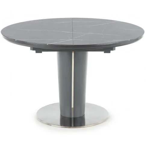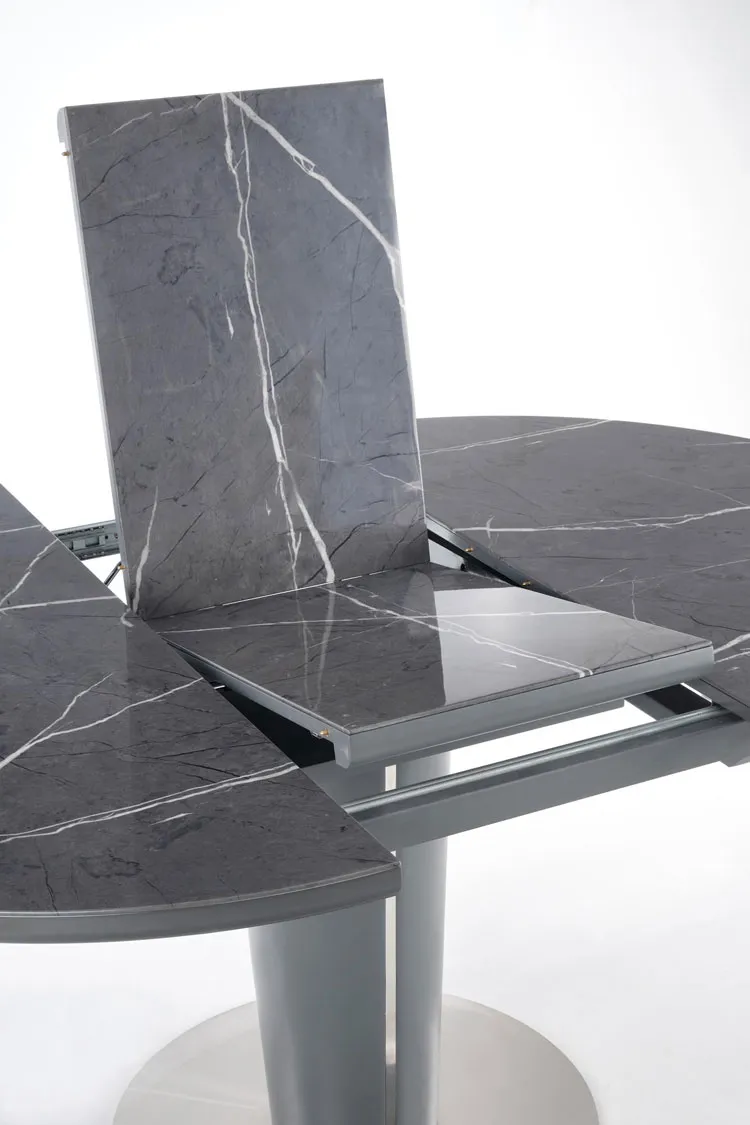 Stół to przede wszystkim miejsce sprzyjające spokojnemu jedzeniu. Jest to także przestrzeń do wspólnych rozmów, zabaw i relaksu. Ten prezentowany przez nas to szczególnie przyjazny element umeblowania. Okrągły blat wykonany z płyty meblowej pokryty warstwą szkła z motywem imitującym marmur został wsparty na jednej nodze, która jednocześnie służy jako schowek na dodatkowy element mebla. Oryginalny projekt, wzbogacony o funkcję rozkładania, która pozwoli Ci na zwiększenie powierzchni użytkowej. Jest to niekonwencjonalne rozwiązanie, dzięki któremu z łatwością rozłożysz mebel w odpowiedniej ku temu sytuacji. Dodatkowo kolorystyka i kształt pozwolą Ci na ustawienie mebla w salonie, jadalni, kuchni lub przestrzeni komercyjnej zaaranżowanej w stylu nowoczesnym, minimalistycznym oraz glamour.