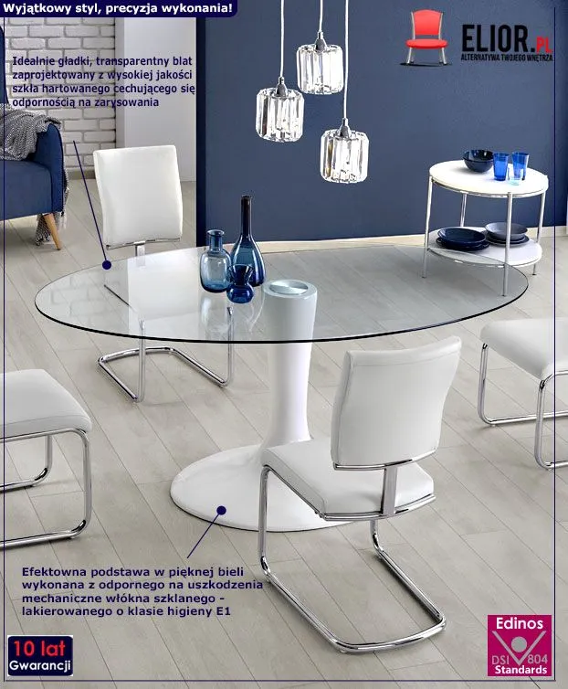 Mebel został zaprojektowany z wysokiej klasy, starannie wyselekcjonowanych i specjalistycznie obrobionych materiałów. To widać już na pierwszy rzut oka – idealnie gładki blat i solidna podstawa prezentują się nad wyraz estetycznie i szykownie. Jeśli precyzyjne wykonanie mebla jest u Ciebie na pierwszym miejscu, stół Pinki na pewno Cię usatysfakcjonuje swoim kunsztem. Blat mebla został zaprojektowany z transparentnego, hartowanego szkła, które cechuje się ponadprzeciętną odpornością na zarysowania. Odpowiednie szlifowanie gwarantuje totalną gładkość, a co za tym idzie – łatwość w czyszczeniu blatu. Podstawa to z kolei odporne na uszkodzenia mechaniczne, niezwykle wytrzymałe tworzywo z włókna szklanego – lakierowanego o klasie higieny E1. Delikatna forma nogi w białym kolorze perfekcyjnie komponuje się z przezroczystą górą. Kolor biały i transparentny tworzą idealny zestaw, który ozdobi Twój salon w przepiękny sposób.