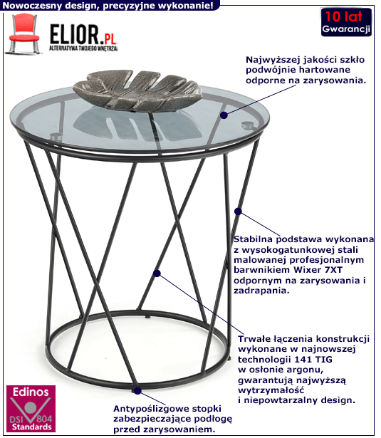 Salon - najważniejsze, reprezentacyjne wnętrze w naszym mieszkaniu. To w nim spędzamy wolny czas, relaksujemy się po ciężkim dniu, oraz przyjmujemy gości. Jego wygląd jest więc niesamowicie ważny. Odpowiednio urządzone wnętrze wpływa na nasze samopoczucie każdego dnia, a aromatyczna kawa w towarzystwie dostojnej sofy uzupełnionej eleganckim stolikiem kawowym smakuje bez wątpienia dużo lepiej. Stolik kawowy Shelli to nieskazitelnie gładki, dymiony blat szklany uniesiony na modernistycznej, czarnej podstawie. Tak wygodna i ciekawa forma połączona z zaskakującą stylistyką spodoba się bez wątpienia zarówno wielbicielom aranżacyjnej świeżości, jak i tym, którzy wybierają naturalne propozycje. Swoją doskonałą prezencję oraz niepodważalną trwałość zawdzięcza wysokogatunkowym materiałom oraz aranżacyjnej fantazji niezastąpionych projektantów marki Elior. Shelli zapewnia wygodę nie tylko w domowych przestrzeniach, ale także komercyjnych. To doskonałe rozwiązanie do wnętrz w stylu industrialnym, nowoczesnym, art deco, a nawet jako oryginalne uzupełnienie stylu skandynawskiego. Pełen wdzięku i niesamowitej lekkości stolik kawowy Shelli świetnie sprawdzi się w salonie, sypialni, biurze czy też poczekalni. Ten perfekcyjny mebel nada Twojej aranżacji niepowtarzalnego charakteru, który wpisuje się w obecne trendy aranżacyjne i stanie się bez wątpienia kropką nad "i" w Twojej doskonałej aranżacji.