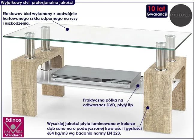 Designerski stolik pod telewizor Virella wyróżnia się nie tylko swoją praktyczną formą i eleganckim kształtem, ale także zastosowaniem materiałów najlepszej jakości. To dlatego cieszy się on powodzeniem wśród osób lubiących nowatorskie rozwiązania. Efektowny blat wyprodukowano z podwójnie hartowanego szkła o grubości aż 10 mm, dzięki czemu jest on całkowicie odporny na rysy i uszkodzenia. Użyta do produkcji konstrukcji szafki laminowana płyta meblowa w kolorze dąb sonoma została uszlachetniona cienkimi filmami melaminowymi. Posiada także specjalne włókna ułożone różnokierunkowo o strukturze sinusoidalnej, co zapewnia nadanie jej cech jakościowych oraz wytrzymałościowych. Duża szklana półka jest niezwykle praktyczna i bez problemu pozwala Ci zmieścić nie tylko odtwarzacz DVD czy kolekcję filmów. Prosta kolorystyka i elegancka forma sprawiają, że szafka RTV Victp doskonale sprawdza się we wnętrzach urządzonych w stylu minimalistycznym, skandynawskim czy nowoczesnym. Stolik marki Profeos zapewnia Ci niezapomniane chwile przy ulubionym programie w gronie przyjaciół i rodziny. Spraw by to właśnie Twój stolik RTV prezentował się lepiej niż niektóre z programów telewizyjnych!