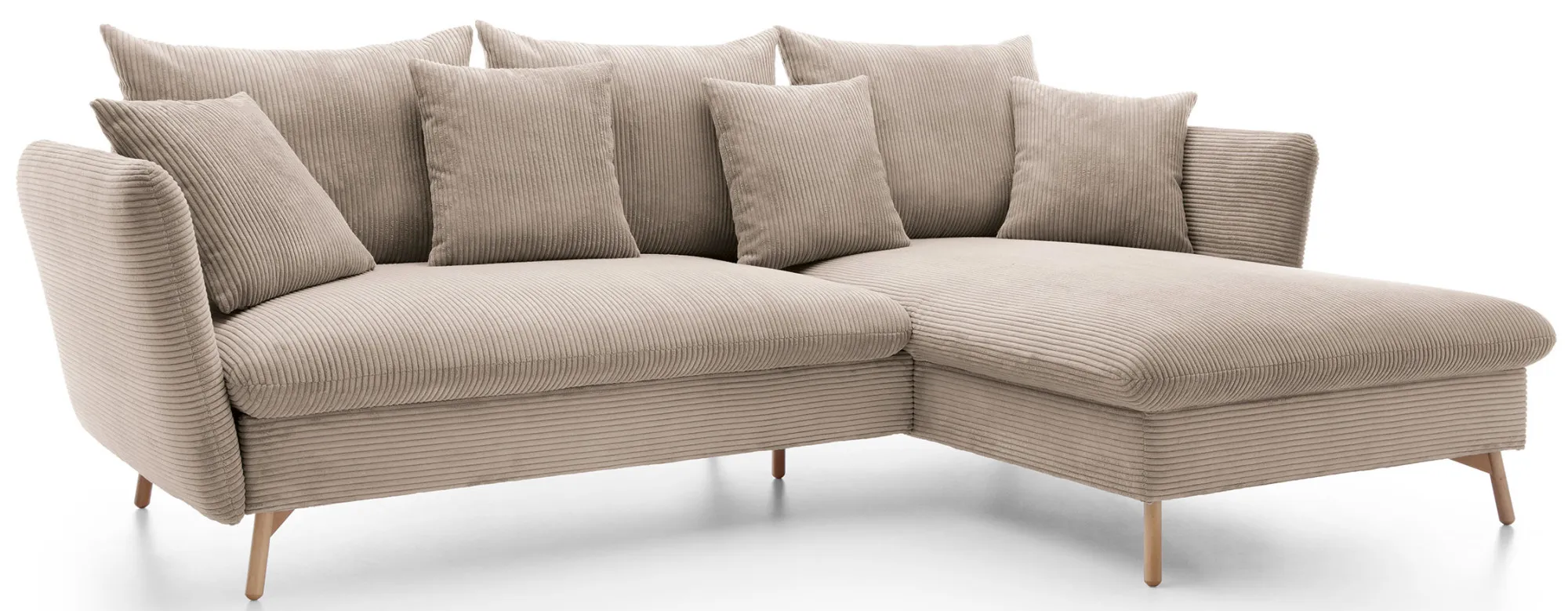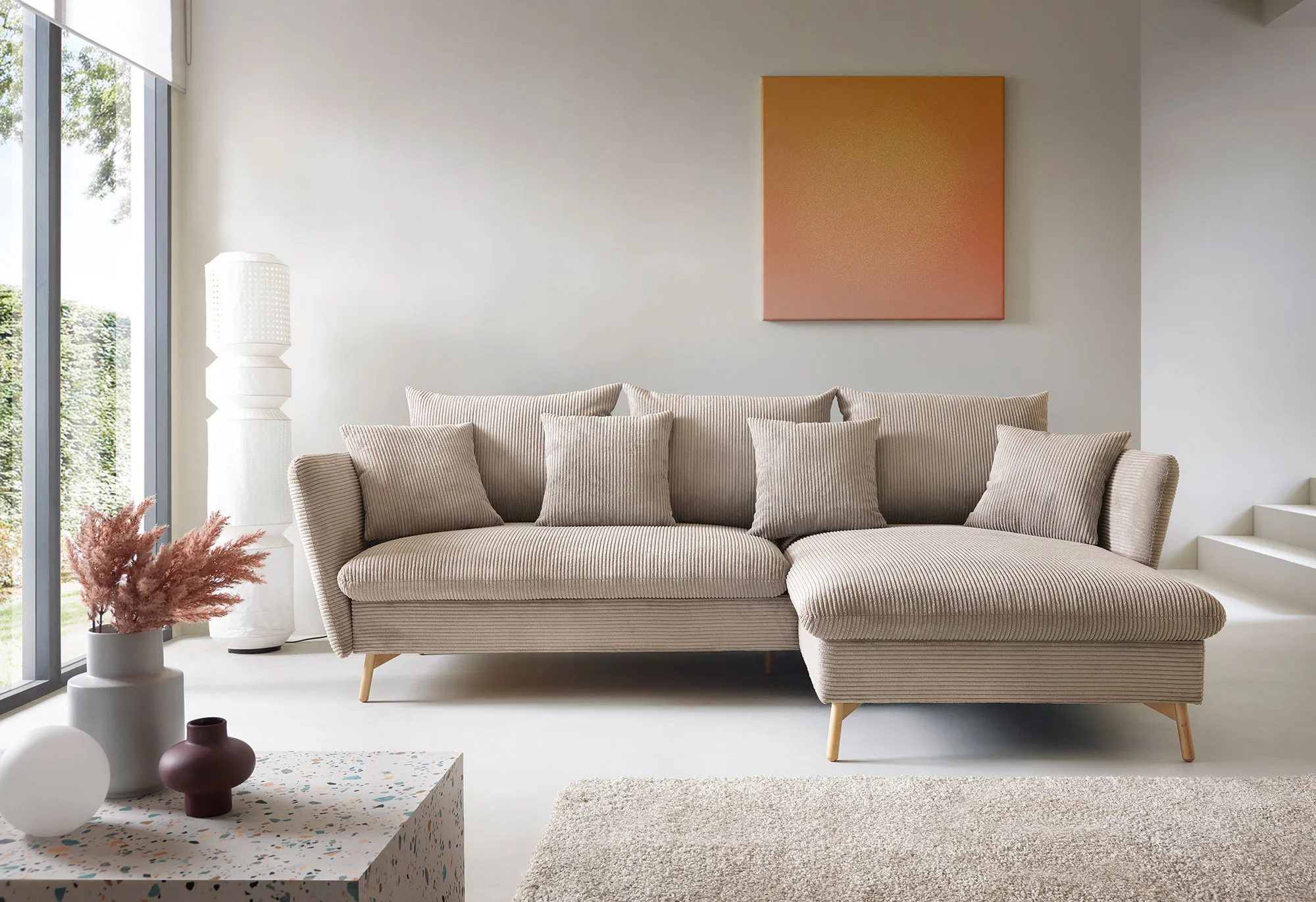Wnętrze z wykorzytsaniem sztruksowej kanapy narożnej Vettio cappuccino