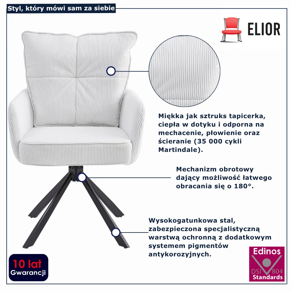 To dobry wybór jeśli szukasz jednego fotela, który będzie pełnił funkcję zarówno miejsca do czytania jak i pracy przy laptopie. Kremowy kolor sztruksu wprowadza przytulność, konstrukcja obrotowa pozwala łatwo zmieniać pozycję bez wstawania. Mechanizm działa płynnie i nie wymaga użycia dużej siły a z kolei podstawa nie przesuwa się po podłodze.