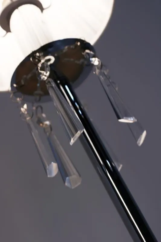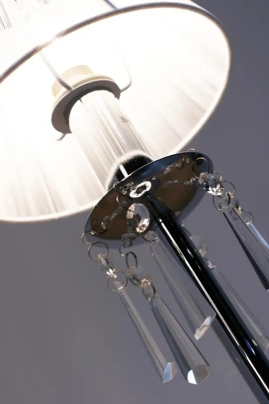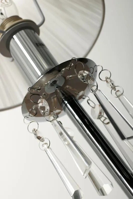 E703-Oscam to przyciągająca spojrzenia lampka utrzymana w stylu klasycznym. Jasny, materiałowy abażur nadaje lampie ciekawy a zarazem elegancki wygląd. Jej znakiem szczególnym są ozdobne kryształki zwisające z chromowanej, zaokrąglonej oprawy. Lampa została wyprodukowana z materiałów najwyższej jakości, dzięki czemu doskonale prezentuje się na każdym suficie. Szczególnie polecana do stylowych wnętrz.