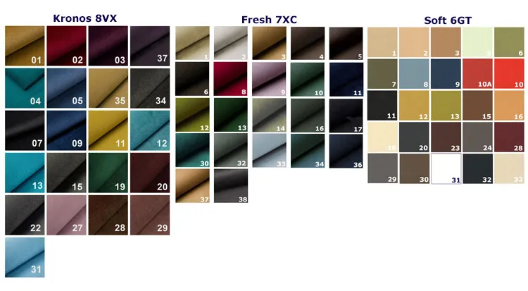 • Fresh 7XC - francuska tkanina typu velvet o wysokiej odporności na ścieranie i zaplamienia, o aksamitnej fakturze.
