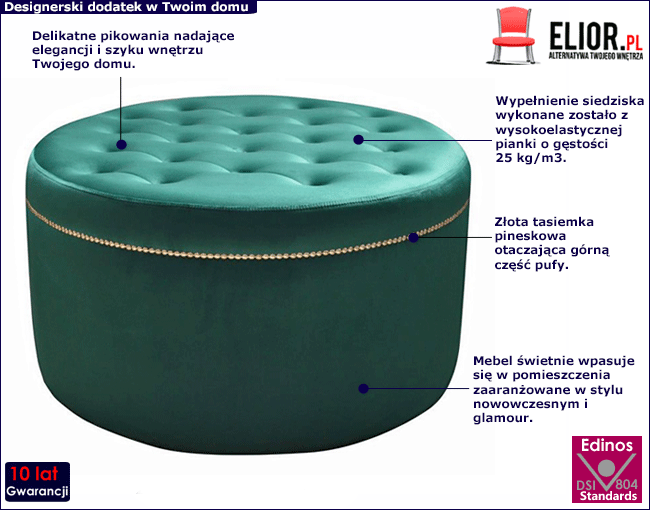 Zastanawiasz się jak możesz ulepszyć otaczającą Cię przestrzeń? Czasami wystarczy naprawdę niewiele by poczuć się lepiej wśród własnych czterech ścian. Jednym z elementów, który w nieinwazyjny sposób odmieni wnętrze Twojego domu, a jednocześnie zadba o elegancję i szyk będzie prezentowana przez nas pufa tapicerowana. Jej ekskluzywna tapicerka uszlachetniona o subtelne pikowane detale idealnie zaprezentuje się w salonie, przedpokoju czy sypialni zaaranżowanej w stylu glamour. Optymalne wymiary i klasyczny kształt wpasują się w wnętrza i miejsca, które pragniesz i z pewnością świetnie się w nich sprawdzą. Okrągłe, wygodne siedzisko sprawi, że zapragniesz wypoczynku w towarzystwie tego mebla. Z pewnością będzie on idealnym elementem wypoczynkowym w zestawieniu z sofą, kanapą i wersalką. Wykorzystasz go także jako komfortowy podnóżek dla zmęczonych nóg, a w przypadku spotkania z bliskimi zyskasz dodatkowe miejsce do spoczynku dla osoby, która Cię odwiedzi.