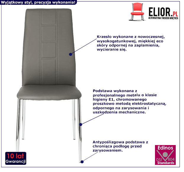 Stylowo zaprojektowane krzesło Corse jest meblem cechującym się elegancką, ale i pełną wdzięku formą. Jest to zasługa między innymi starannie dobranych i niezwykle trwałych materiałów meblarskich. Dzięki nim tapicerowane krzesło Corse użytkuje się naprawdę wygodnie, przyjemnie i co istotne – bez uszkodzeń przez wiele lat. Do produkcji niezawodnego w wielu nowoczesnych wnętrzach krzesła Corse wykorzystano poddane specjalistycznej obróbce, nowoczesne surowce. Są to: profesjonalny metal o klasie higieny E1, chromowany proszkowo metodą elektrostatyczną, odporny na zarysowania i uszkodzenia mechaniczne oraz wysokogatunkowa, miękka eco skóra, odporna na zaplamienia i wycieranie się. Jakże to istotne, by meble, w które inwestujemy, cechowało wytrzymałe, staranne wykonanie. Na szczęście z szarym krzesłem Corse nie trzeba się o to martwić! Ten pełen wyrafinowanego, a przy tym interesującego charakteru mebel wciąż cieszy oko niebywałym wdziękiem. Eleganckie krzesło Corse posiada bezsprzecznie wiele zalet – trwałość, stabilność, dokładne wykonanie, funkcjonalizm i oczywiście świeżą, pełną klasy i pomysłowości prezencję. Chyba każdy przyzna, że warto mieć tak ekstrawagancki i funkcjonalny mebel w swoich starannie i przemyślanie zaaranżowanych i wypielęgnowanych stylowo przestrzeniach.