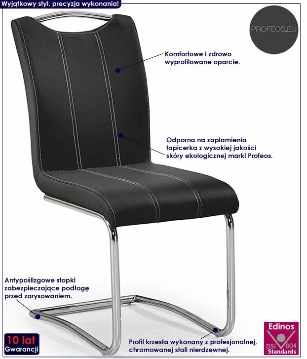 Nowoczesne i komfortowe krzesło Dello wyróżnia się nie tylko swoją unikalną formą, ale także zastosowaniem materiałów najlepszej jakości. Designerska tapicerka w kolorze czarnym pokryta została wysokiej jakości ekoskórą (skórą ekologiczną), łatwą do utrzymania w czystości. Ekoskóra używana przy produkcji mebli marki Profeos jest o wiele bardziej odporna na słońce oraz substancje płynne , co pozwala Ci na długie i bezpieczne użytkowanie. Już nie musisz się martwić, że rozlana kawa spowoduje konieczność wymiany mebla. Skóra ekologiczna marki Profeos została pokryta warstwą polichlorku winylu, dzięki czemu jest także odporna na działanie środków dezynfekujących na bazie rozpuszczalników - chemikalia te niszczą skórę naturalną. Profil krzesła stworzony jest z najwyższej jakości chromowanej stali o zawartości aż stali nierdzewnej oraz chromu, co gwarantuje mu niezwykły efekt wizualny, posiadając przy tym ponadprzeciętne cechy antykorozyjne oraz lepszą odporność na uszkodzenia mechaniczne . Stonowana kolorystyka sprawia, że nowe krzesło Dello świetnie odnajduje się w przestrzeni mieszkalnej, restauracyjnej czy biurowej. Pozwól mu efektownie odmienić także Twoje wnętrze!