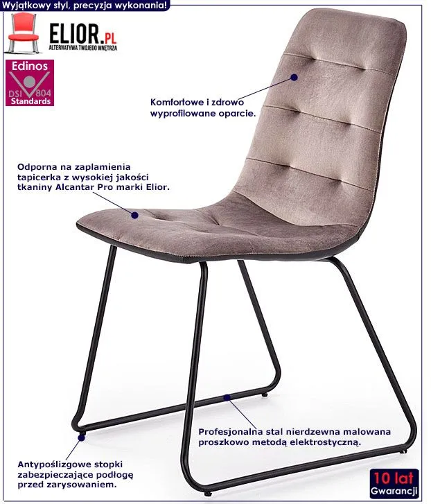 Oryginalne zaprojektowane krzesło Danter wyróżnia się nie tylko swoją unikalną formą, ale także zastosowaniem materiałów najlepszej jakości. Designerska pikowana tapicerka w kolorze popielatym wykonana została z wysokiej jakości tkaniny Alcantar Pro, charakteryzującej się dużą odpornością na ścieranie i zabrudzenie oraz niezwykłą miękkością w dotyku (dzięki warstwie poliuretanu). Tkanina Alcantar Pro, która jako jedyna na rynku produkowana jest z dokładnie wyselekcjonowanych ultramikrowłókien o objętości aż do 24-razy drobniejszej od ludzkiego włosa, charakteryzuje się wyjątkową żywotnością, odpornością oraz niezwykłą łatwością w utrzymaniu. Posiada ponadprzeciętne cechy wytrzymałościowe, dzięki czemu unikniesz co sezonowej wymiany tapicerki. Tkanina Alcantar jest także bardzo praktyczna i można ją czyścić na mokro, co jest szczególnie istotne w przypadku mebli wykorzystywanych podczas spożywania posiłków. Plama po porannej kawie lub wieczornym przyjęciu z czerwonym winem nie spowoduje już więcej konieczności wymiany tapicerki. Tylna, ciemnopopielata strona oparcia pokryta jest mocną i trwałą skórą ekologiczną. Ecoskóra marki Elior została pokryta warstwą polichlorku winylu, dzięki czemu jest odporna na działanie środków dezynfekujących na bazie rozpuszczalników - chemikalia te niszczą skórę naturalną. Czarny profil mebla stworzony jest z najwyższej jakości nierdzewnej stali malowanej odpornym na zarysowania i zadrapania. Najwyższa jakość techniki polimeryzacji pozwoliła zaoferować firmie Elior aż 10 lat gwar. na swoje produkty. Już nie musisz się martwić, że po kilku latach część farby odpryśnie od mebla . Krzesło marki Elior zapewnia Ci niezapomniane chwile przy stole w gronie przyjaciół i rodziny. Sprawdź, jak niesamowicie mebel prezentuje się ten mebel na żywo!