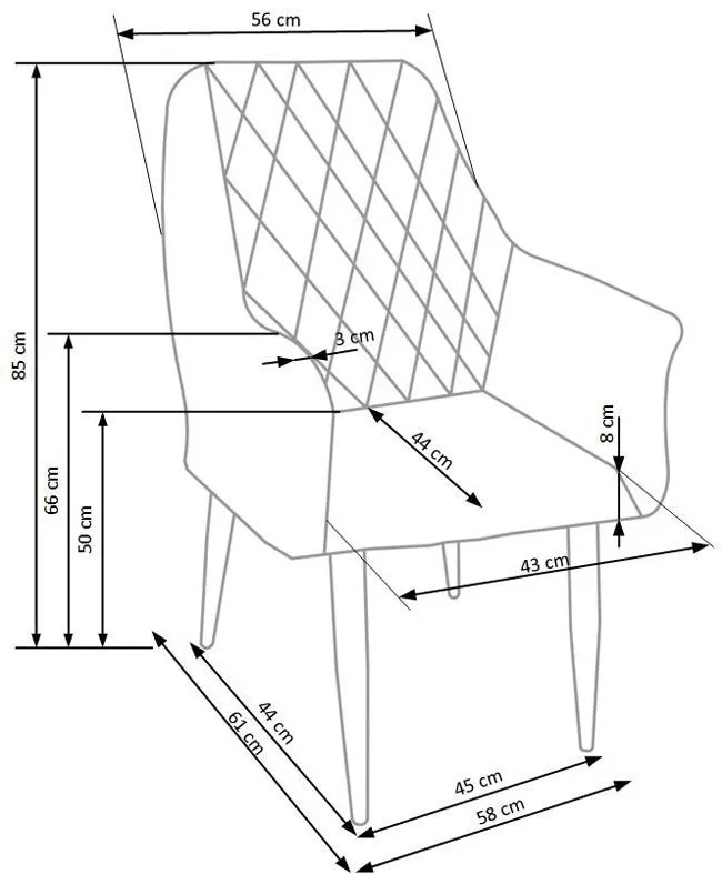 - Wymiary: szerokość mebla: 58 cm, szerokość siedziska: 43 cm, głębokość mebla: 61 cm, głębokość siedziska: 44 cm, wysokość siedziska: 50 cm, wysokość całkowita: 85 cm.