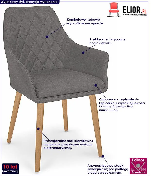Niebanalnie zaprojektowane krzesło Xurof 2X wyróżnia się nie tylko swoją unikalną formą, ale także zastosowaniem materiałów najlepszej jakości. Pikowana tapicerka krzesła w kolorze popielatym wykonana została z wysokiej jakości tkaniny Alcantar Pro, charakteryzującej się dużą odpornością na ścieranie i zabrudzenie oraz niezwykłą miękkością w dotyku (dzięki warstwie poliuretanu). Tkanina Alcantar Pro, która jako jedyna na rynku produkowana jest z dokładnie wyselekcjonowanych ultramikrowłókien o objętości aż do 24-razy drobniejszej od ludzkiego włosa, charakteryzuje się wyjątkową żywotnością, odpornością oraz niezwykłą łatwością w utrzymaniu. Posiada ponadprzeciętne cechy wytrzymałościowe, dzięki czemu unikniesz co sezonowej wymiany tapicerki. Tkanina Alcantar jest także bardzo praktyczna i można ją czyścić na mokro, co jest niezwykle istotne w przypadku mebli wykorzystywanych podczas spożywania posiłków. Profil krzesła wyprodukowano z najwyższej jakości nierdzewnej stali malowanej odpornym na zarysowania i zadrapania. Najwyższa jakość techniki polimeryzacji pozwoliła zaoferować firmie Elior aż 10 lat gwar. na swoje produkty. Już nie musisz się martwić, że po kilku latach część farby odpryśnie od mebla Najmodniejsza kolorystyka oraz wyjątkowa, współczesna forma sprawiają, że krzesło Syvis doskonale odnajduje się we wnętrzach mieszkalnych i komercyjnych urządzonych zarówno w stylu nowoczesnym, jak też loftowym, industrialnym czy minimalistycznym. Krzesło marki Elior zapewnia Ci niezapomniane chwile w czasie spotkań w gronie przyjaciół i rodziny. Sprawdź już teraz, jak niesamowicie mebel prezentuje się na żywo!