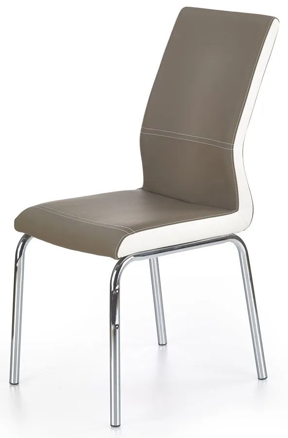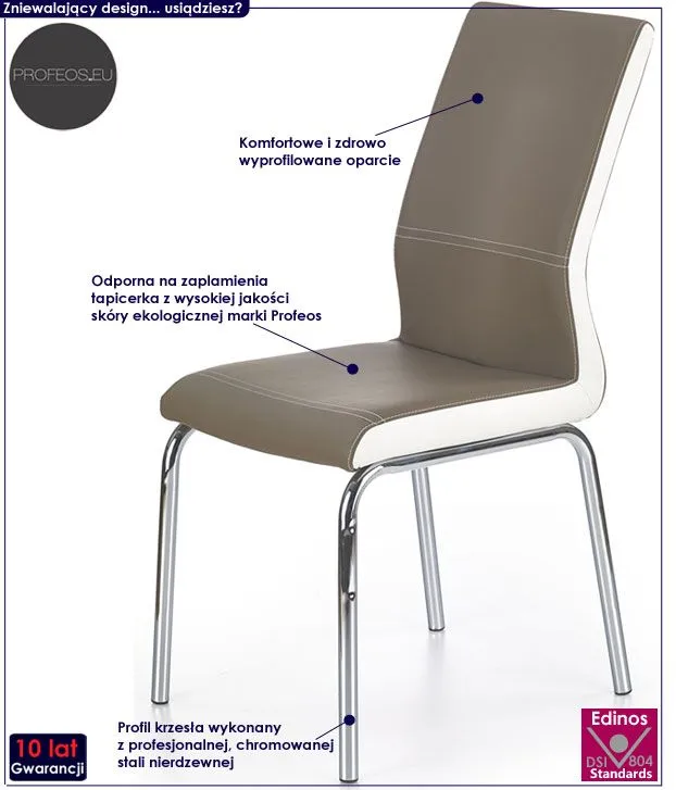 Komfortowe krzesło Merkur wyróżnia się nie tylko swoją unikalną formą, ale także zastosowaniem materiałów najlepszej jakości. Designerska tapicerka mebla w kolorze cappuccino pokryta została najwyższej jakości ekoskórą (skórą ekologiczną), łatwą do utrzymania w czystości. Ekoskóra używana przy produkcji mebli marki Profeos jest o wiele bardziej odporna na słońce oraz substancje płynne , co pozwala Ci na długie i bezpieczne użytkowanie. Już nie musisz się martwić, że rozlana kawa spowoduje konieczność wymiany mebla. Skóra ekologiczna marki Profeos została pokryta warstwą polichlorku winylu. Profil krzesła stworzony jest z najwyższej jakości chromowanej stali o zawartości aż stali nierdzewnej oraz chromu, co gwarantuje mu niezwykły efekt wizualny, posiadając przy tym ponadprzeciętne cechy antykorozyjne oraz lepszą odporność na uszkodzenia mechaniczne . Stonowana kolorystyka sprawia, że nowe krzesło Merkur świetnie odnajdzie się w przestrzeni mieszkalnej, restauracyjnej czy biurowej. Wnieś do swego wnętrza nastrojowy klimat, harmonizując go z ciepłem naturalnych barw!
