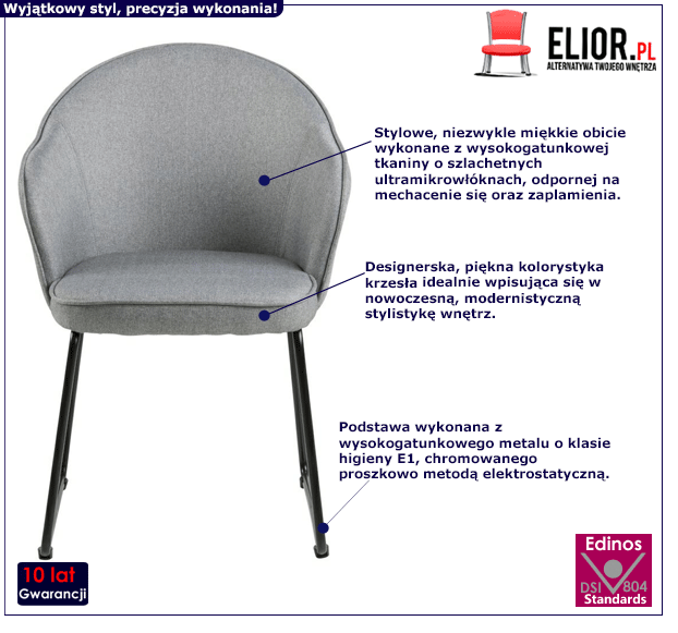 Interesująco zaprojektowane krzesło Andy jest meblem cechującym się awangardową, ale i uniwersalną formą. Jest to zasługa między innymi starannie dobranych i niezwykle trwałych materiałów meblarskich. Dzięki nim krzesło Andy użytkuje się naprawdę wygodnie, przyjemnie i co istotne – bez uszkodzeń przez wiele lat. Do produkcji krzesła wykorzystano poddane specjalistycznej obróbce, nowoczesne surowce. Są to: profesjonalny metal o klasie higieny E1, odporne na rysy i uszkodzenia mechaniczne, chromowany proszkowo metodą elektrostatyczną oraz miękka tkanina o szlachetnych ultramikrowłóknach, odporna na zaplamienia i wycieranie się. Jakże to istotne, by meble, w które inwestujemy, cechowało wytrzymałe, staranne wykonanie. Na szczęście z fantastycznym krzesłem do salonu Andy nie trzeba się o to martwić! Ten pełen wyrafinowanego, a przy tym interesującego charakteru mebel wciąż cieszy oko niebywałym wdziękiem. Modne krzesło Andy posiada bezsprzecznie wiele zalet – trwałość, stabilność, dokładne wykonanie, funkcjonalizm i oczywiście świeżą, pełną klasy i pomysłowości prezencję. Chyba każdy przyzna, że warto mieć tak ekstrawagancki i funkcjonalny mebel w swoich starannie i przemyślanie zaaranżowanych przestrzeniach. Z wygodnie i trwale zaprojektowanym krzesłem Andy na pewno urządzisz się komfortowo i stylowo. Ten piękny mebel ozdobi Twoje wnętrze i nada mu zniewalającego, jedynego w swoim rodzaju charakteru!