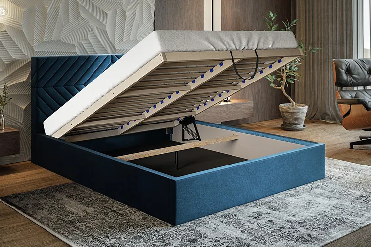• Łóżko wyposażone jest w pojemnik na pościel, stelaż metalowy na gazowych podnośnikach, oraz wysokiej jakości nowoczesny materac do wyboru.