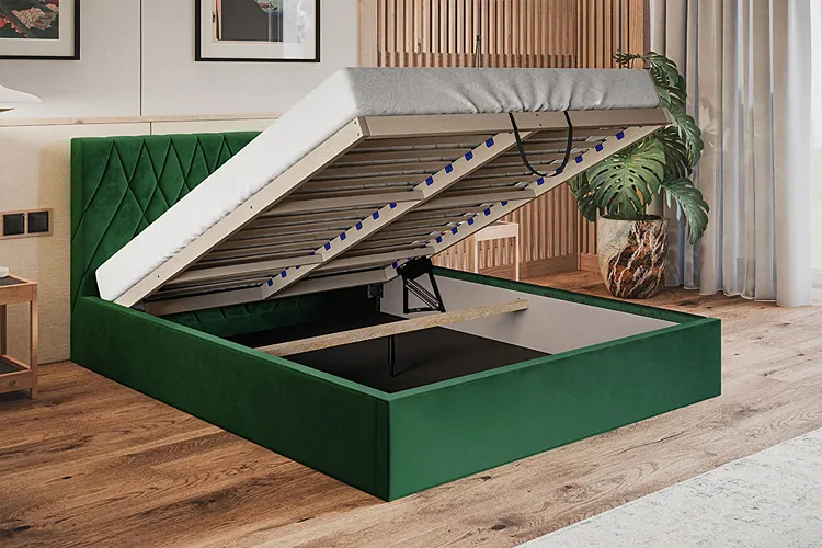 • Łóżko wyposażone jest w pojemnik na pościel, stelaż drewniany na sprężynowych podnośnikach, oraz wysokiej jakości nowoczesny materac do wyboru.