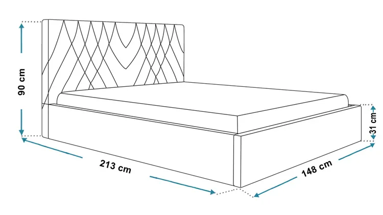 • Wymiary łóżka: długość: 213 cm, szerokość: 148 cm, wysokość zagłowia: 90 cm, wysokość materacy: 17 - 19 cm.