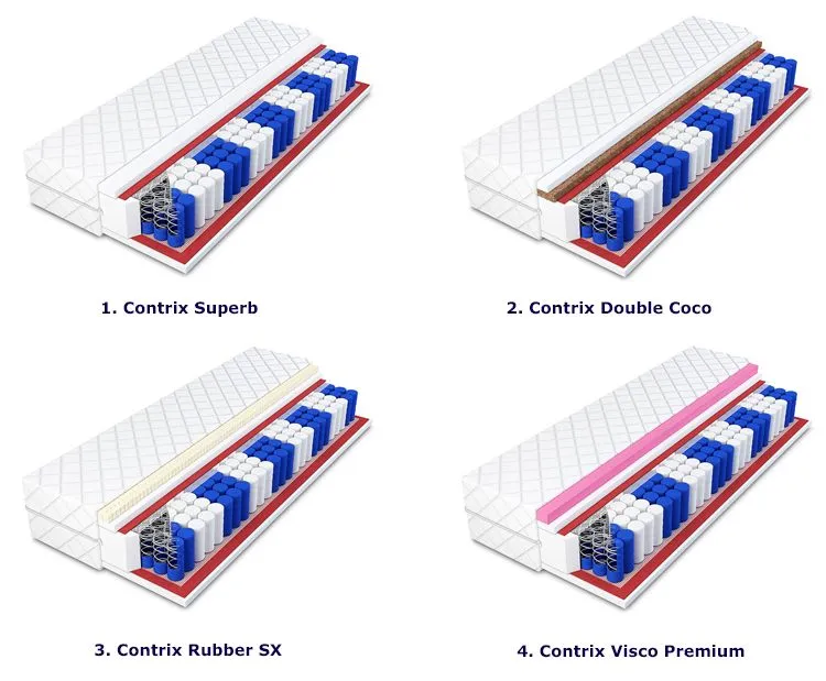 1. Contrix Superb – 17 cm komfortowy materac zbudowany z systemu kieszeni elastic pocket, dwustronnie obłożony pianką poliuretanową T25 o zwiększonej elastyczności i odporności na odkształcenia oraz wygniatanie, co zapewnia właściwy odpoczynek i pozytywnie wpływa na komfort snu.